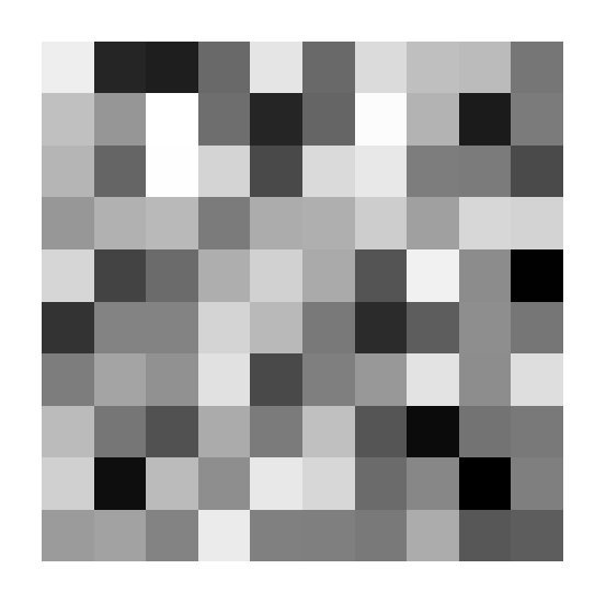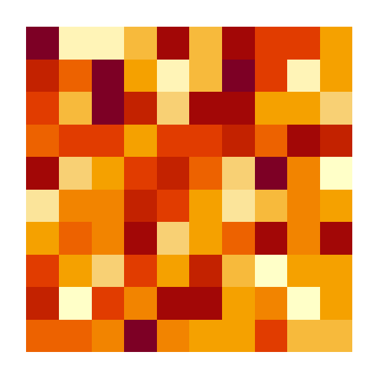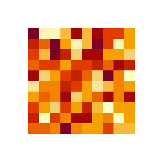 M <- matrix(rnorm(100, 1.5), nrow=10) par(mar=c(5,5,5,5)) image(M, useRaster=TRUE, axes=FALSE)