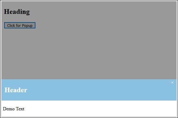 Here’s how a popup looks like below with header and a text. You can also add a footer to it −