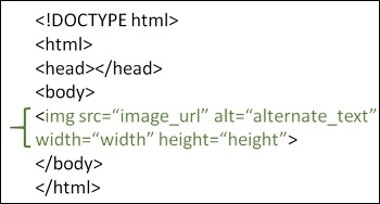 <!DOCTYPE html> <html> <head> <title>HTML img tag</title> </head> <body> <h1>Tutorialspoint</h1> <h2>Simply Easy Learning</h2> <img src="/green/images/logo.png" alt="Tutorialspoint" width="260" height="100"> </body> </html>