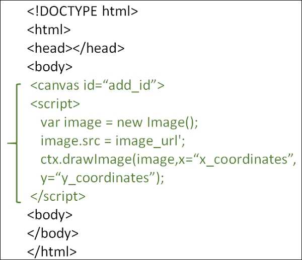 You can try to run the following code to learn how to use images with HTML Canvas. Here, the image is a reference to an image or canvas object. x and y form the coordinate on the target canvas where our image should be placed.