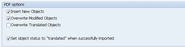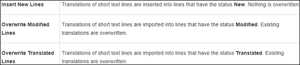 You can use “Short Text-Specific Options” group box, use any combination of the checkboxes to specify if the translated short texts are only inserted into the system (existing translated short texts are not overwritten) or if modified or translated lines are overwritten with the new translations.