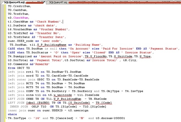 T4.SumApplied as 'Amount Paid on Invoice',T9.U_FloorNo,T5.U_UnitCode,T5.U_Type,