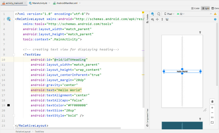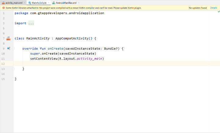 In the above screen we can get to see our kotlin file. This file is located within our app>java>app's package name. In this file we have to write the business logic which we will be using to perform some actions within our android applications. Inside this file we can add click listeners for our views which we have created in our xml file or we can set data to our views. We have to add actions for different views inside on Create method.
