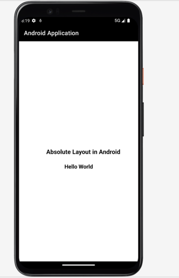 <?xml version="1.0" encoding="utf-8"?> <AbsoluteLayout xmlns:android="http://schemas.android.com/apk/res/android" xmlns:app="http://schemas.android.com/apk/res-auto" xmlns:tools="http://schemas.android.com/tools" android:layout_width="fill_parent" android:layout_height="fill_parent" android:orientation="vertical" tools:context=".MainActivity"> <!--Creating a text view for heading on below line--> <TextView android:layout_width="wrap_content" android:layout_height="wrap_content" android:layout_x="90dp" android:layout_y="350dp" android:text="Absolute Layout in Android" android:textColor="@android:color/black" android:textSize="20sp" android:textStyle="bold" /> <!-- creating a text view for sub heading on below line--> <TextView android:layout_width="wrap_content" android:layout_height="wrap_content" android:layout_x="150dp" android:layout_y="400dp" android:text="Hello World" android:textColor="@android:color/black" android:textSize="18sp" android:textStyle="bold" /> </AbsoluteLayout>