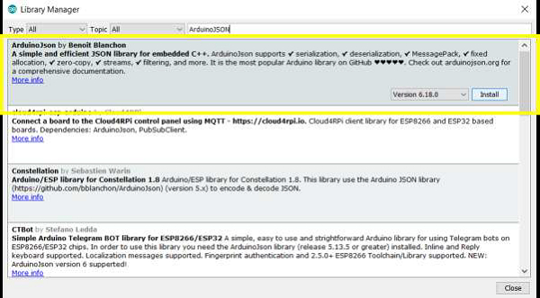 The ArduinoJSON library, as the name suggests, helps you work with JSON objects on Arduino. In order to install it, go to the Library Manager and search for ArduinoJSON. Install the library by Benoit Blanchon.