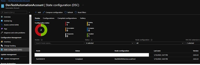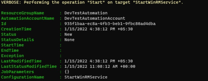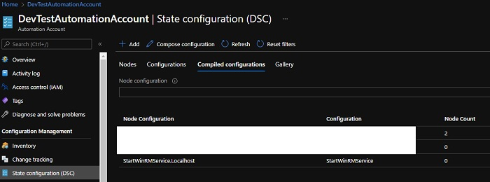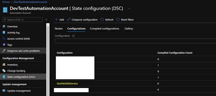 To run the configuration on the Azure Nodes, we need to compile the configuration which generates the MOF file “ConfigurationName.LocalHost” in this case it is “StartWinRMService.LocalHost”. To compile the configuration using PowerShell, we can use the Start-AzAutomationDscCompilationJob command.