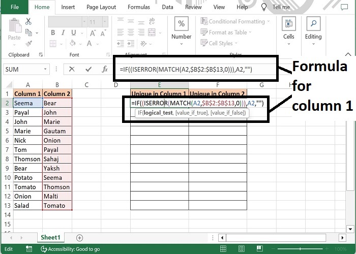 For instance, we have two columns in a data set having some names. And now we want to identify what names are repeating in either list. For this, we can apply a formula in two other columns, to get the unique values of both the columns. Let's see how we can achieve this.