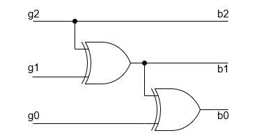 The logic circuit implementation of this 3-bit gray to binary code converter is shown in the following figure.