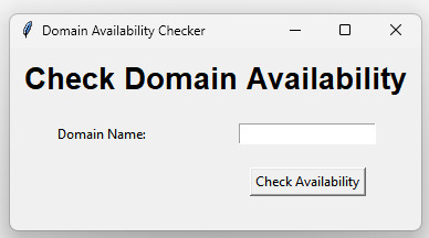 When you run the code, you should see a GUI window with a heading, a label and an entry field to enter the domain name, a "Check Availability" button, and a label to display the availability status. When you enter a domain name and click on the button, the availability status will be displayed in the label widget.