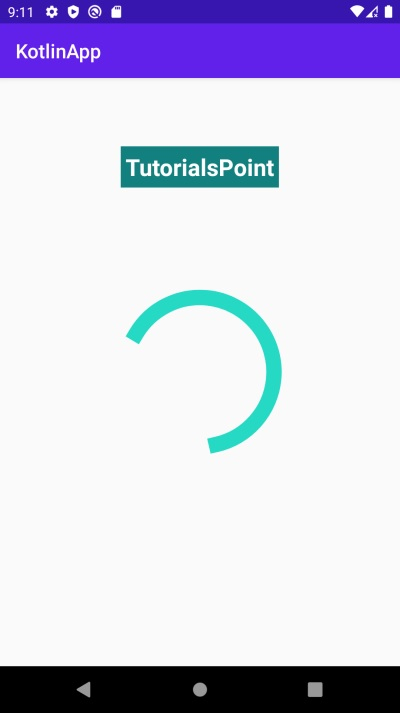 <?xml version="1.0" encoding="utf-8"?> <RelativeLayout xmlns:android="http://schemas.android.com/apk/res/android" xmlns:tools="http://schemas.android.com/tools" android:layout_width="match_parent" android:layout_height="match_parent" tools:context=".MainActivity"> <TextView android:layout_width="wrap_content" android:layout_height="wrap_content" android:layout_centerHorizontal="true" android:layout_marginTop="70dp" android:background="#008080" android:padding="5dp" android:text="TutorialsPoint" android:textColor="#fff" android:textSize="24sp" android:textStyle="bold" /> <ProgressBar android:layout_centerInParent="true" android:layout_width="200dp" android:layout_height="200dp" style="?android:progressBarStyleLarge" android:progress="100" android:id="@+id/progressBar" android:progressDrawable="@drawable/circle"/> </RelativeLayout>