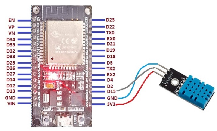 Step 3 ? The DHT22 sensor's Vin is to be connected to the 3V3 / Vin pin of ESP32. Connect the DHT22 sensor's GND to the GND pin of ESP32. Connect the data pin of the DHT22 sensor to the D15 pin of ESP32.