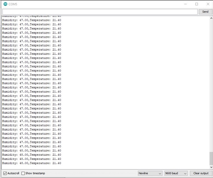 Fig: Showing the result of temperature and humidity readings using Serial Monitor