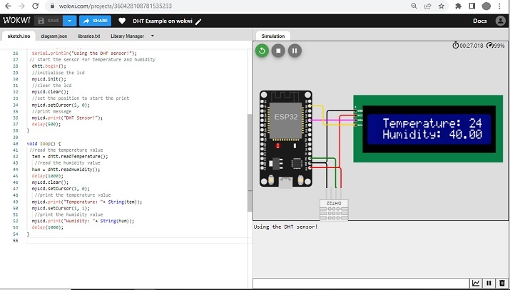 Example 2: Showing the readings from the DHT22 sensor using Wokwi Simulator and LCD display