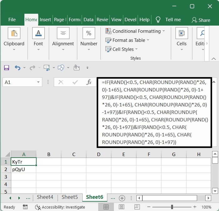 =IF(RAND()<0.5, CHAR(ROUNDUP(RAND()*26, 0)-1+65),CHAR(ROUNDUP(RAND()*26, 0)-1+97))&IF(RAND()<0.5,CHAR(ROUNDUP(RAND()*26, 0)-1+65), CHAR(ROUNDUP(RAND()*26, 0)-1+97))&IF(RAND()<0.5, CHAR(ROUNDUP(RAND()*26, 0)-1+65), CHAR(ROUNDUP(RAND()*26, 0)-1+97))&IF(RAND()<0.5,CHAR(ROUNDUP(RAND()*26, 0)-1+65), CHAR(ROUNDUP(RAND()*26, 0)-1+97))