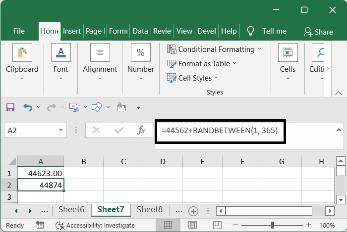 Now that we understand how dates are handled in Excel, let's imagine you want to generate a random number between 2022-01-01 and 2023- 01-01. 2022-01-01 is 44562 and 2023-01-01 is 44927. 44927- 44562 = 365 days.