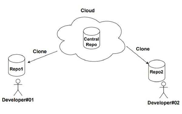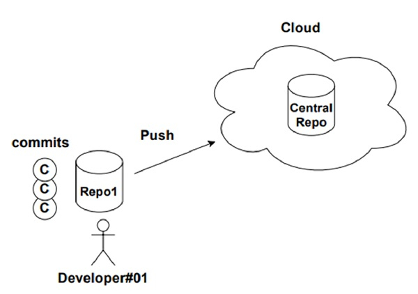 Developer#01 will clone the repository to his local machine, work on the project by performing multiple commits and will share the changes by pushing the changes to the central repository as shown below.