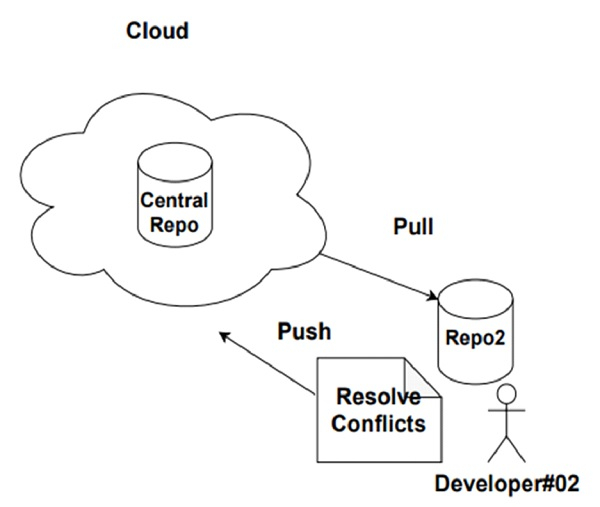 When Developer#02 has to see the changes done by Developer#01 he will pull the changes from the central repository, resolve any existing conflicts and push the changes back to the central repository.