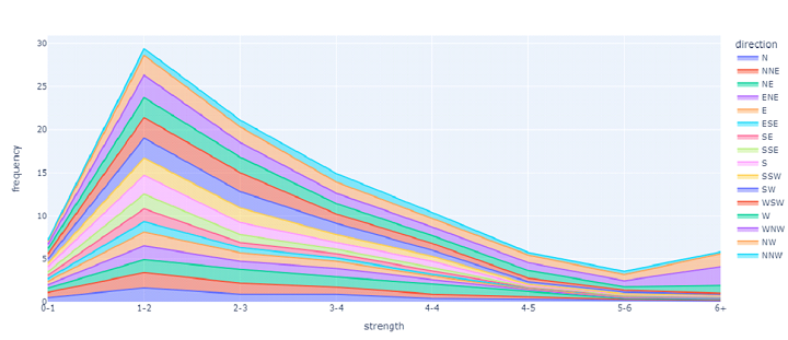 import plotly.express as px df = px.data.wind() fig = px.area(df, x="strength", y="frequency", color="direction",) fig.show()