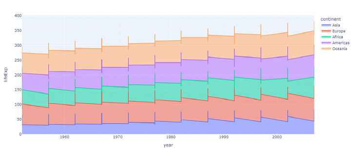 import plotly.express as px df = px.data.gapminder() fig = px.area(df, x="year", y="lifeExp", color="continent") fig.show()