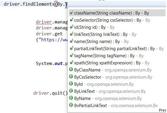 The below image shows the list of methods available with findElements.