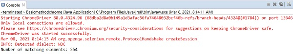 The findElements method returns a list of elements which match with the locator (with the By object) passed as a parameter to the method. To count the number of elements returned by the list, the method size is used. If there are no matching elements, an empty list is returned.