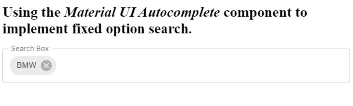 In the example below, we have used the AutoComplete component of Material UI to implement the search bar. We have stored the car brands in the array. Also, we have added the "BMW" as a fixed option.