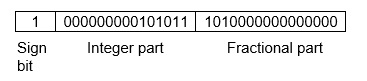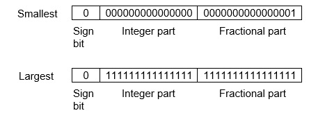 Example −Assume number is using 32-bit format which reserve 1 bit for the sign, 15 bits for the integer part and 16 bits for the fractional part.