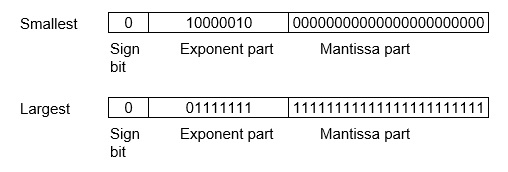 These are above smallest positive number and largest positive number which can be store in 32-bit representation as given above format. Therefore, the smallest positive number is 2-16 ≈ 0.000015 approximate and the largest positive number is (215-1)+(1-2-16)=215(1-2-16) =32768, and gap between these numbers is 2-16.