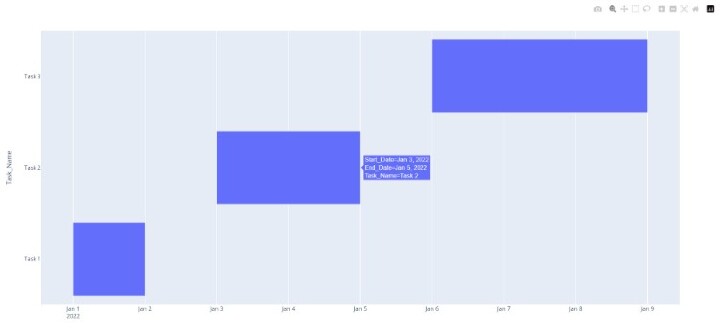 import plotly.express as px fig = px.timeline(df, x_start="Start_Date", x_end="End_Date", y="Task_Name") fig.show()