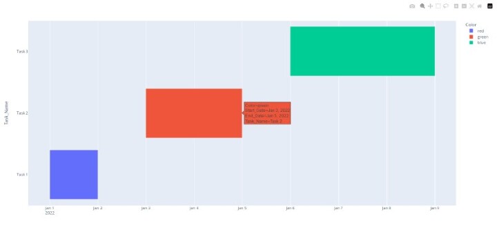 Apply the color parameter to set custom colors for each task based on the Color column in the dataframe. This parameter allows us to specify a column in the dataframe that contains color values for each task, which are used to color-code the bars in the Gantt chart.