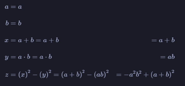 This example shows how symbolic math calculations on variables can be carried out using HandCalcs. The two variables a and b are defined, and the variables x and y are created through addition and multiplication processes. The third variable, z, which is the outcome of a more difficult algebraic equation, is then calculated using x and y.