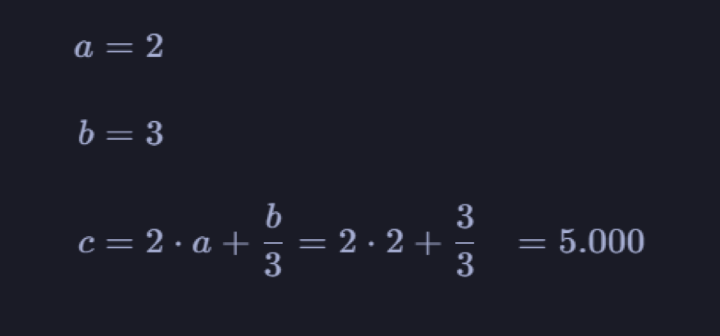 This illustration shows how to use HandCalcs to carry out fundamental numerical arithmetic tasks. It sets the three variables a, b, and c and applies mathematical operations to determine the resultant number c