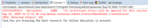 We can check if some text exists or not in a page with Selenium. There are more than one ways to find it. We can use the getPageSource() method to fetch the full page source and then verify if the text exists there. This method returns content in the form of string.