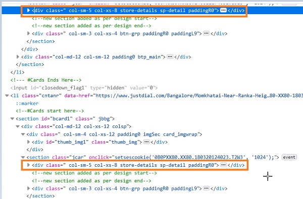 Let us see the html code of elements with div tag having the same value set for the class attribute (as highlighted in the image). The value of the class attribute is - colsm-5 col-xs-8 store-details sp-detail paddingR0.