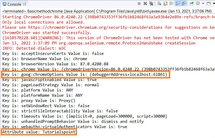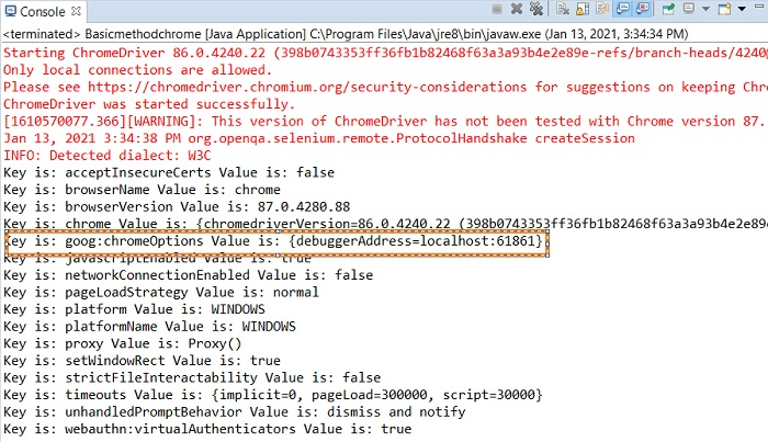 In the above image we have highlighted the parameter debuggerAddress having the value localhost:61861. We shall add this key value pair to an instance of the ChromeOptions class.