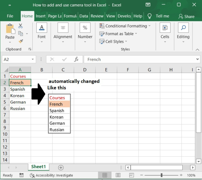 How to add and use camera tool in Excel