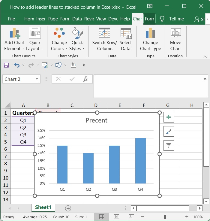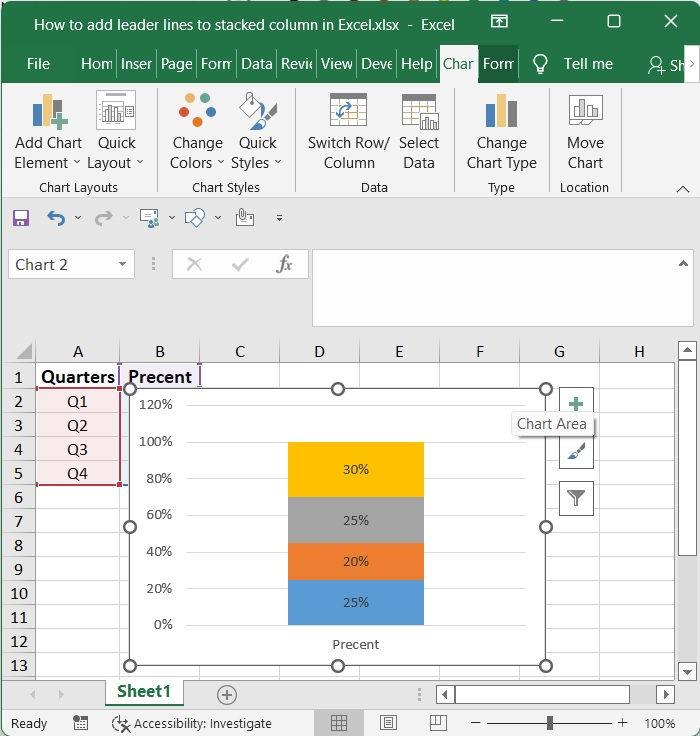 The use of data labels inside a chart makes it much simpler to comprehend the information shown within since they provide specifics on the data points or series of data being displayed. It is not allowed to add leader lines to stacked columns; however, there is a workaround that may be used to display leader lines in Excel spreadsheets that have stacked columns.