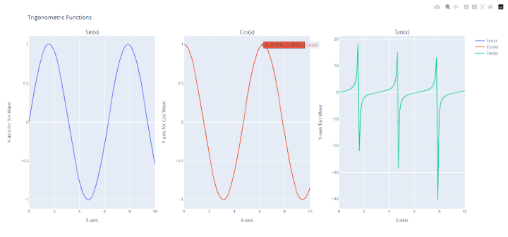 With the add trace() function, each subplot is given a trace after the subplot grid has been created. For each of the three y1, y2, and y3 arrays, a Scatter trace is added. For the three traces, we additionally supply the name parameters as "Sin(x)," "Cos(x)," and "Tan(x)," accordingly. By utilizing the row and col arguments of the add trace() method, we can define the subplot for each trace.