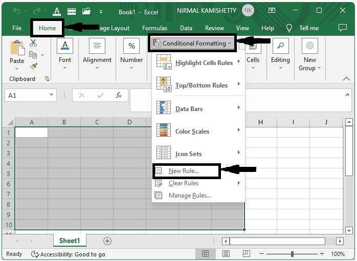 Now select the range of cells you want to add odd or even row colours to, then click on home on the Excel ribbon, then click on conditional formatting, and then select a new rule as shown in the below image. A new pop-up window will be opened.