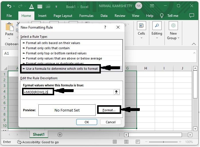 Now in the new pop-up window, click on the use the formula, then enter the formula as =MOD(ROW(),2) in the formula box, and click "Format", as shown in the below image.