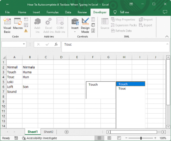 Here we will assign a macro to the textbox. Let us see a simple process to understand how we can autocomplete a text box when typing in Excel. We need to use the comment box and list the ActiveX commands.