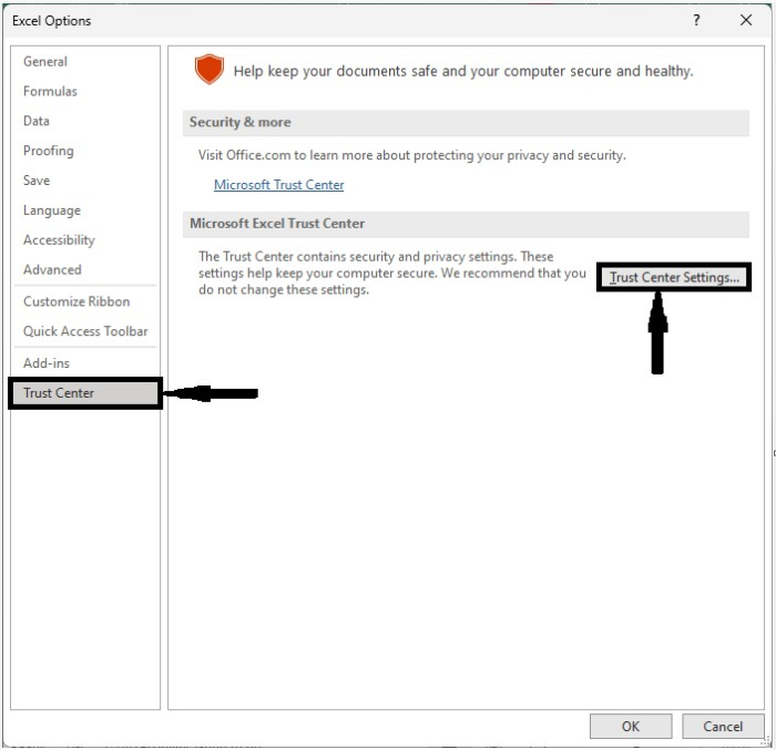 In the pop-up, click on "Trusted centres," then click on "Trusted centre settings" to open a new pop-up.