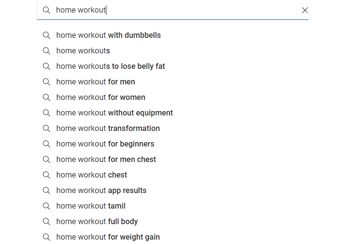 For example I will go with the keyword “Home Workout”. When you type the keyword “Home Workout” in the YouTube search bar, YouTube autosuggest feature will come up with a list of potential keywords which are generally searched by the users. These keywords can be used in your video title, filename, description and tags.