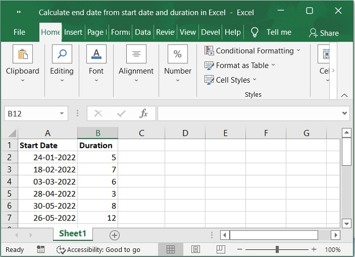 In the first step, let's assume we have a sample data for calculating end date from start date and duration in weeks as shown in the below screenshot for the same.