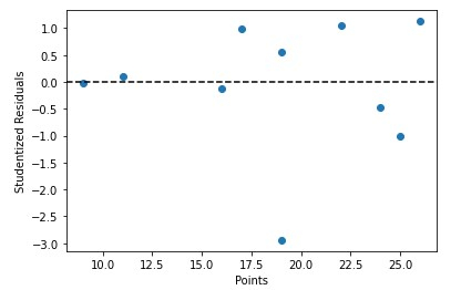 import matplotlib.pyplot as plt #define predictor variable values and studentized residuals x = df['points'] y = stud_res['student_resid'] #create scatterplot of predictor variable vs. studentized residuals plt.scatter(x, y) plt.axhline(y=0, color='black', linestyle='--') plt.xlabel('Points') plt.ylabel('Studentized Residuals')