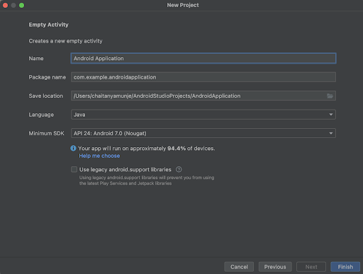 After specifying all the details click on Finish to create a new Android studio project.