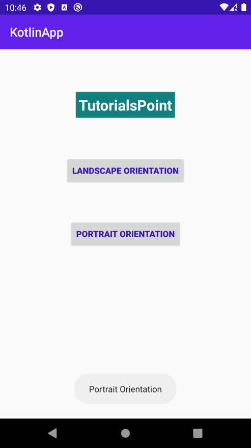 <?xml version="1.0" encoding="utf-8"?> <RelativeLayout xmlns:android="http://schemas.android.com/apk/res/android" xmlns:tools="http://schemas.android.com/tools" android:id="@+id/relativeLayout" android:layout_width="match_parent" android:layout_height="match_parent" tools:context=".MainActivity"> <TextView android:id="@+id/text2" android:layout_width="wrap_content" android:layout_height="wrap_content" android:layout_centerHorizontal="true" android:layout_marginTop="70dp" android:background="#008080" android:padding="5dp" android:text="TutorialsPoint" android:textColor="#fff" android:textSize="24sp" android:textStyle="bold" /> <Button android:id="@+id/buttonSetLandscape" android:layout_width="wrap_content" android:layout_height="wrap_content" android:layout_below="@+id/text2" android:layout_centerHorizontal="true" android:layout_marginTop="62dp" android:text="Landscape Orientation" android:textColor="@color/colorPrimaryDark" android:textStyle="bold" /> <Button android:id="@+id/buttonSetPortrait" android:layout_width="wrap_content" android:layout_height="wrap_content" android:layout_centerInParent="true" android:layout_marginTop="62dp" android:text="Portrait Orientation" android:textColor="@color/colorPrimaryDark" android:textStyle="bold" /> </RelativeLayout>