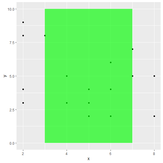 ggplot(df,aes(x,y))+geom_point()+geom_rect(aes(xmin=3,xmax=7,ymin=0,ymax=10),fill="green",alpha=0.05)