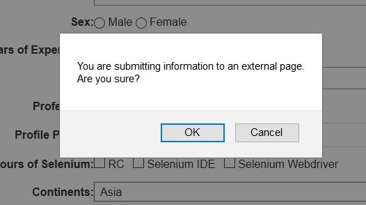 Let us consider the below alert and check its presence on the page. There is a condition called alertIsPresent which we will use to check for alerts. It shall wait for a specified amount of time for the alert after which it shall throw an exception.