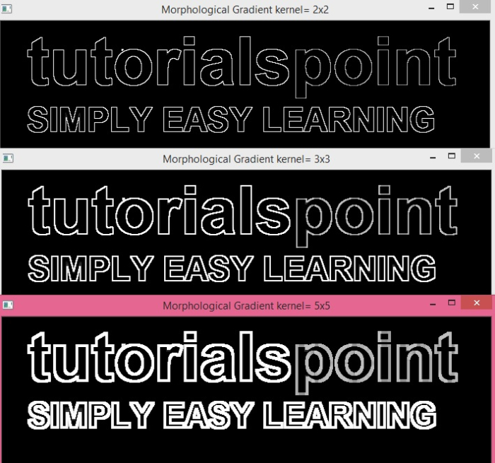 import cv2 import numpy as np img = cv2.imread('tutorialspoint.png',0) kernel1 = np.ones((2,2),np.uint8) gradient1 = cv2.morphologyEx(img, cv2.MORPH_GRADIENT, kernel1) kernel2 = np.ones((3,3),np.uint8) gradient2 = cv2.morphologyEx(img, cv2.MORPH_GRADIENT, kernel2) kernel3 = np.ones((5,5),np.uint8) gradient3 = cv2.morphologyEx(img, cv2.MORPH_GRADIENT, kernel3) cv2.imshow("Morphological Gradient kernel= 2x2", gradient1) cv2.imshow("Morphological Gradient kernel= 3x3", gradient2) cv2.imshow("Morphological Gradient kernel= 5x5", gradient3) cv2.waitKey(0) cv2.destroyAllWindows()